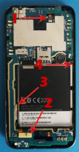 Teraz nale odpiąć wszystkie tasiemki: czujnik światła (1), digitizer (2), LCD – jest od spodu płytki (3) oraz wypiąć z zaczepów czarny przewód – nie trzeba wypinać ze złączy na płycie (4)