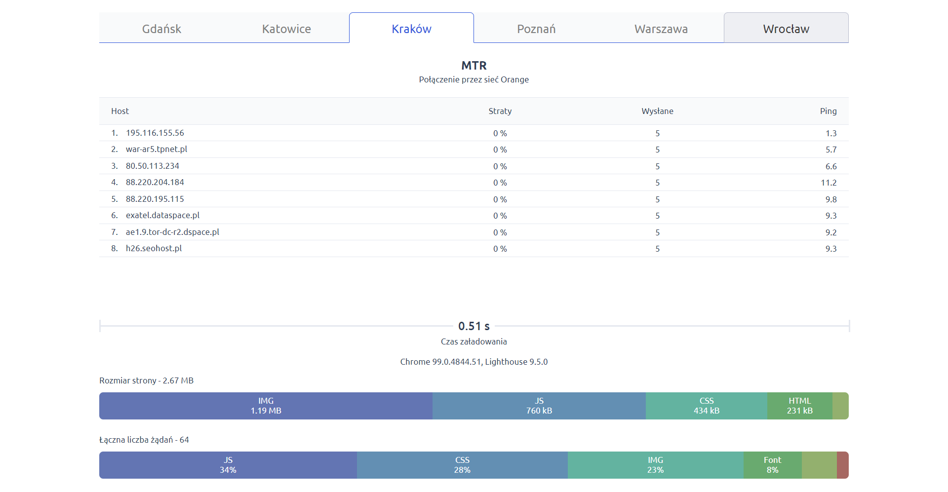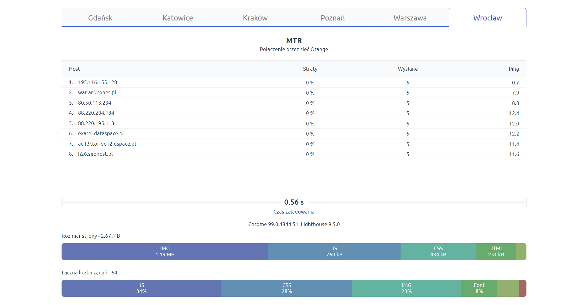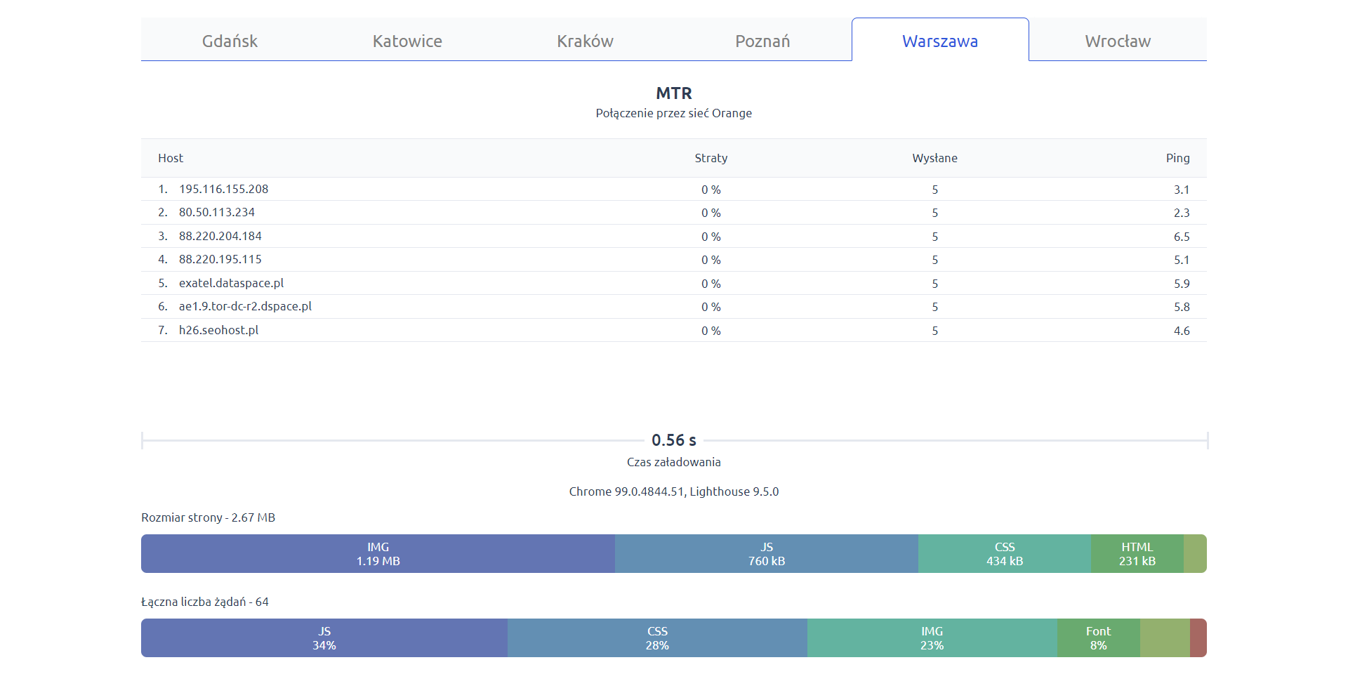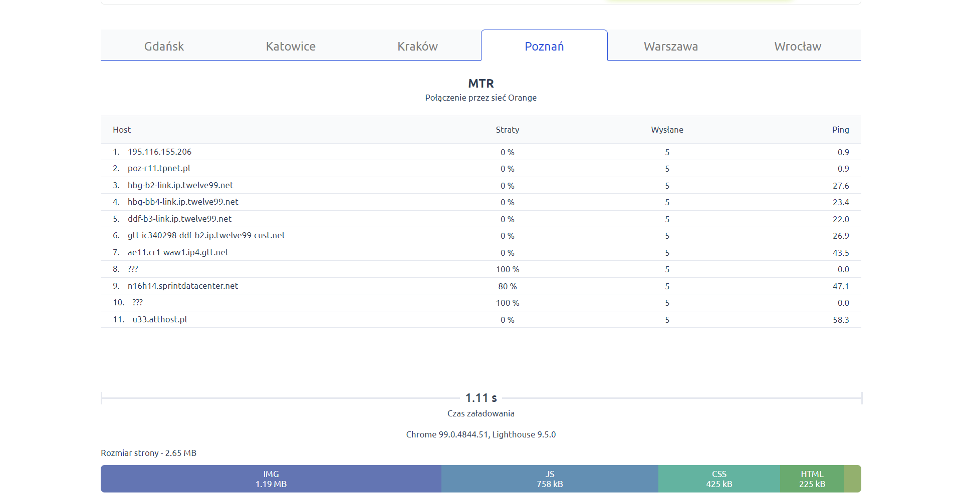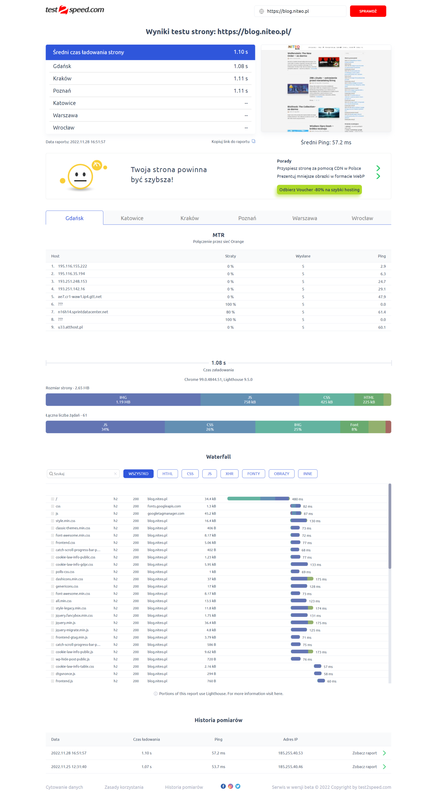 Poniżej kilka screenów z witryn testujących szybkość działania stron, dns i łączenia z serwerami.