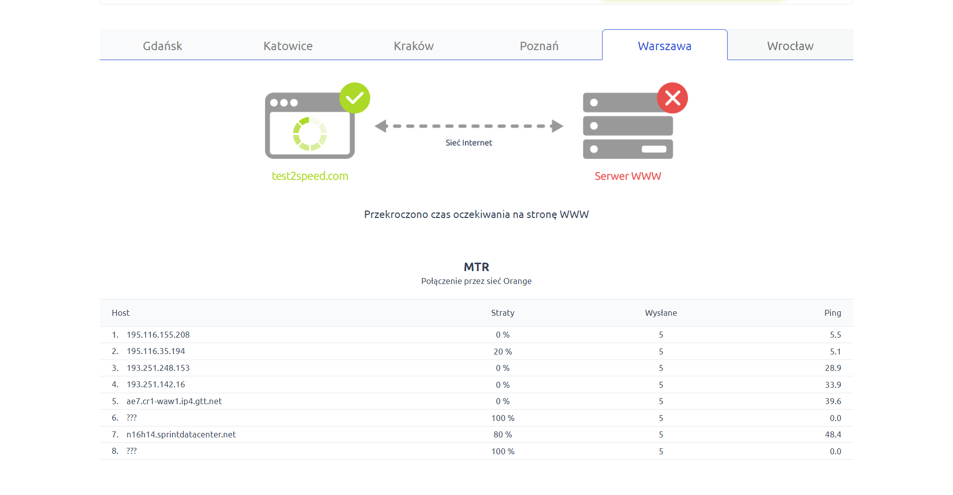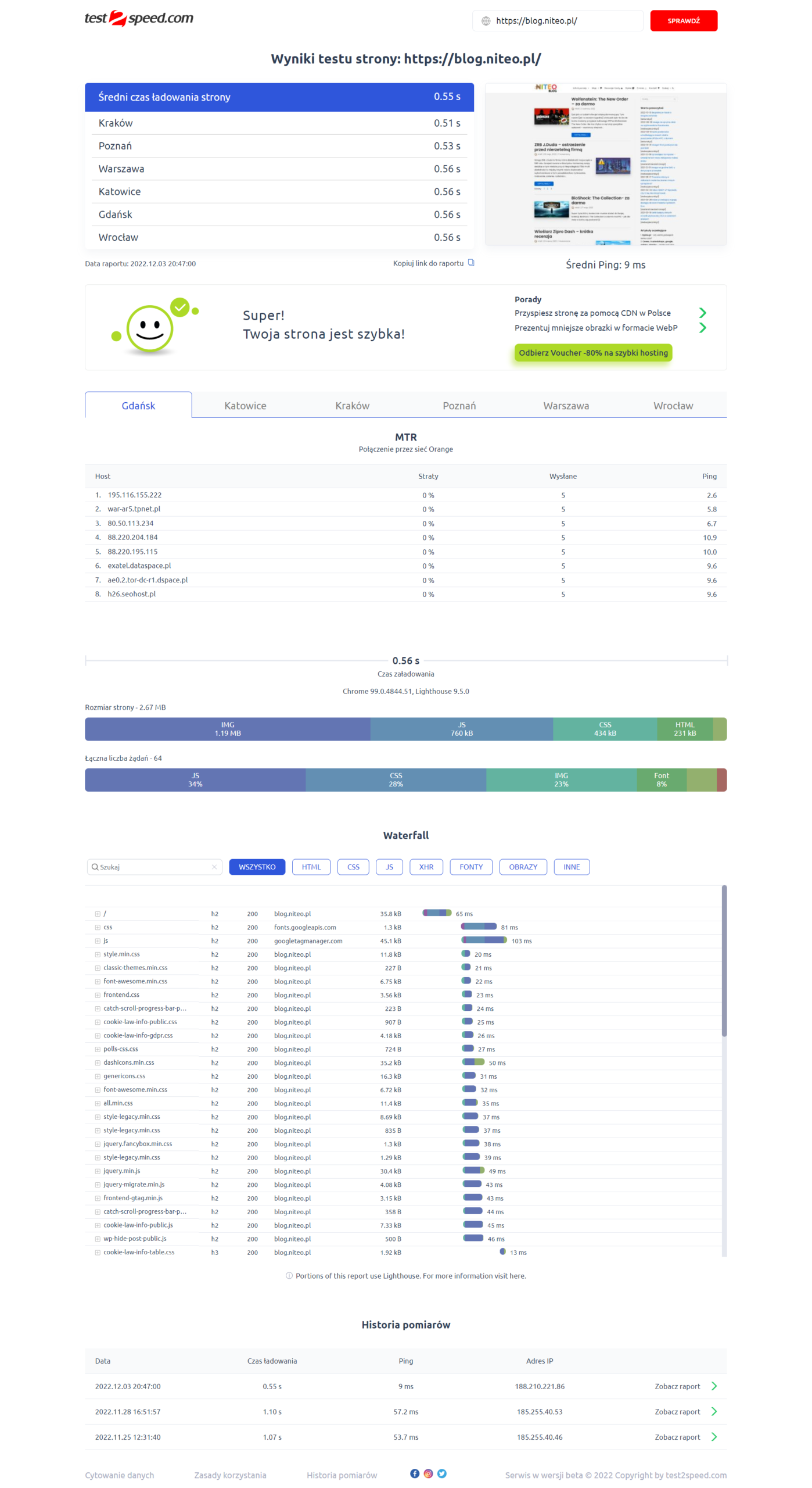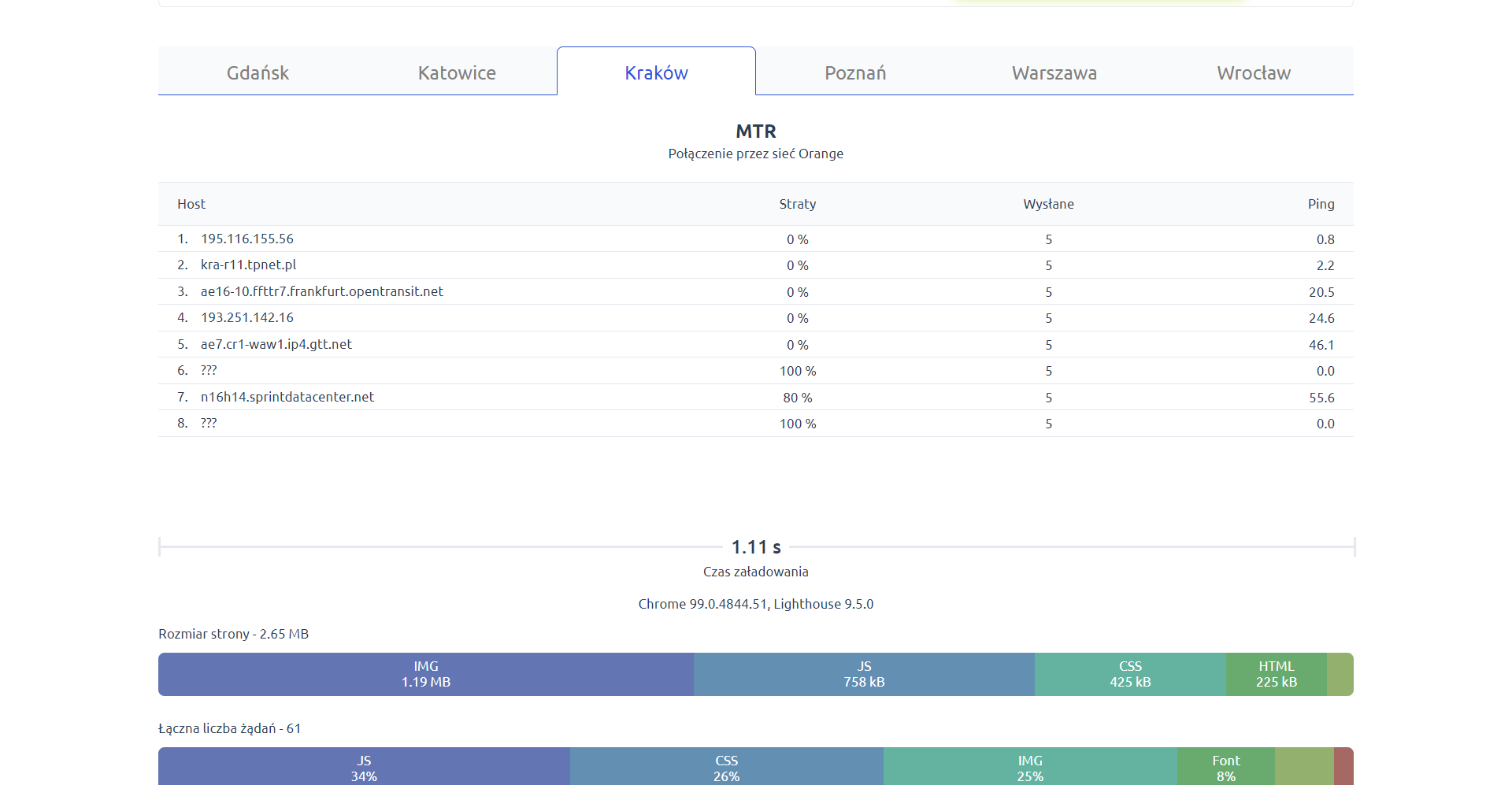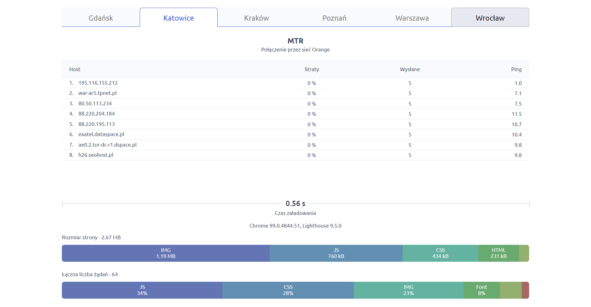 Poniżej kilka screenów z witryn testujących szybkość działania stron, dns i łączenia z serwerami.