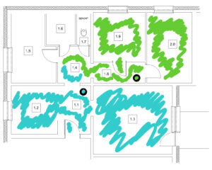 Urządzenie jak można wyczytać z danych producenta “obsługuje” pomieszczenia o pow. do 50m2. Moje M-4 to ok. 75m2 ustawiony na jednym z korytarzy ogarnia połowę mieszkania. Żeby wszystkie pomieszczenia były “oczyszczone” przestawiam go dwukrotnie – ostatni raz do sypialni na noc [1.9]. Pomieszczenie 1.5 to swego rodzaju garderoba i w niej sporadycznie działa sprzęt a drzwi są wiecznie zamknięte.
